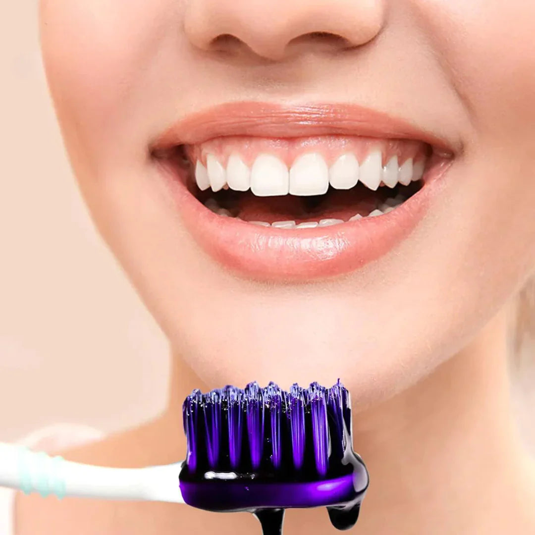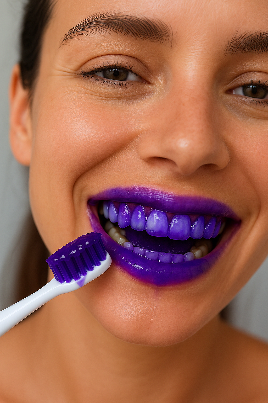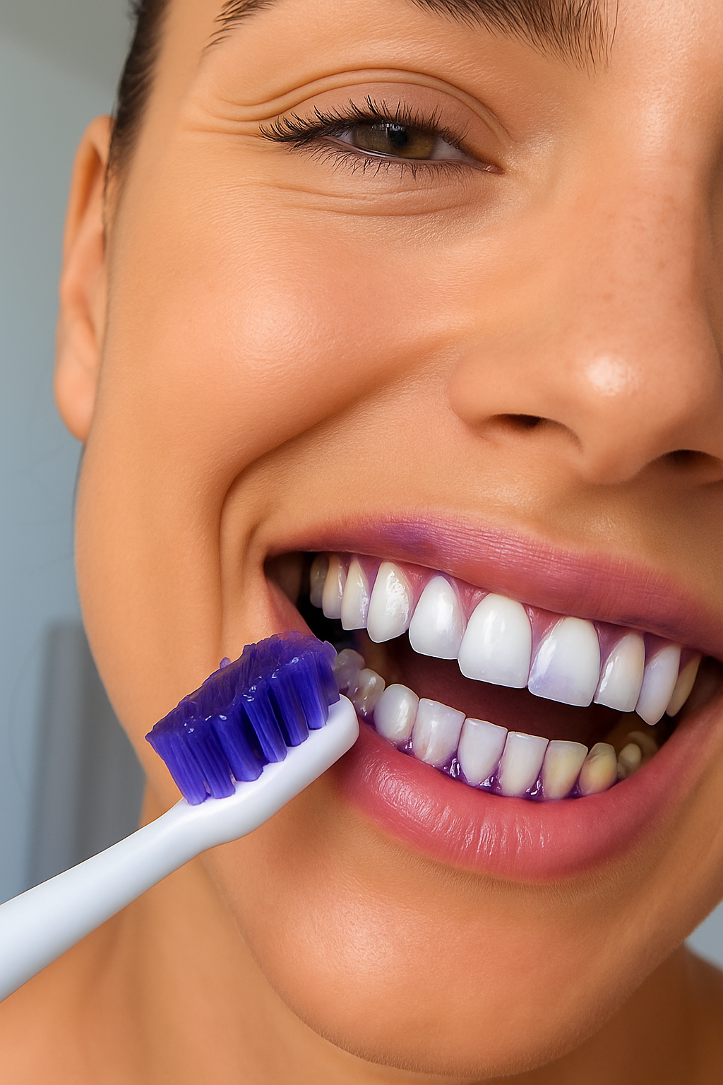 Nasza wyjątkowa fioletowa formuła nie zawiera nadtlenku ani żadnych agresywnych składników. Zamiast tego wykorzystuje technologię korekcji koloru – fiolet neutralizuje żółte tony na zębach, podobnie jak fioletowy szampon eliminuje żółte odcienie z włosów blond. Efekt? Jaśniejszy, świeższy uśmiech już po pierwszym użyciu.